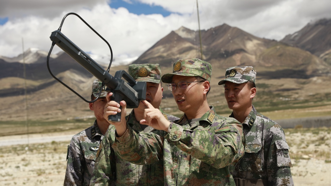 西部戰(zhàn)區(qū)聯(lián)合參謀部某局處長王道彬(右一)組織便攜式監(jiān)測設備狀態(tài)檢測(2022年7月14日攝)。新華社發(fā)(張忠志 攝)