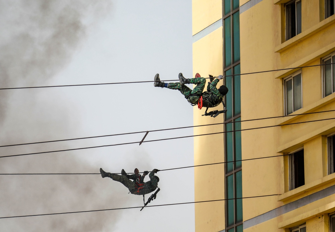 在模擬反恐演練中,武警獵鷹突擊隊特戰(zhàn)隊員利用鐵索接近被“恐怖分子”占據(jù)的樓房(2019年4月4日攝)。新華社發(fā)(楊志毅 攝)