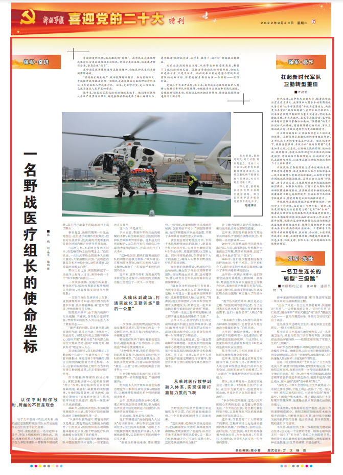 黨的二十大召開在即,連日來,南部戰(zhàn)區(qū)總醫(yī)院的醫(yī)護人員精心做好任務(wù)部隊伴隨保障、積極投身專業(yè)訓練和實戰(zhàn)化演練,苦練戰(zhàn)時保障本領(lǐng),用戰(zhàn)位上的新?lián)斝伦鳛椋苿俞t(yī)院保障力建設(shè)邁上新臺階。