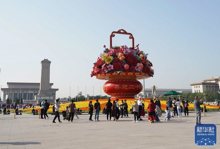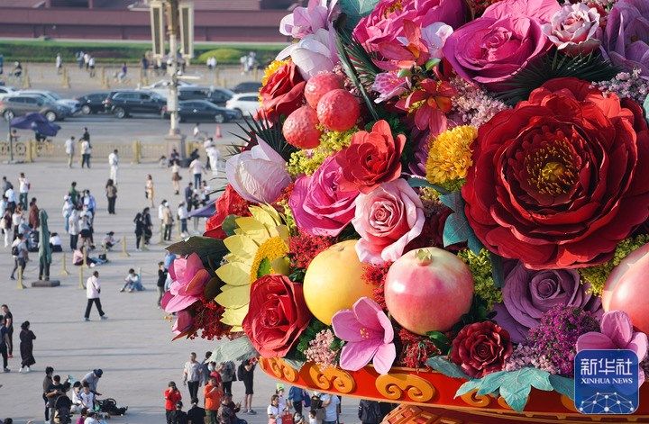 國(guó)慶節(jié)臨近,“祝福祖國(guó)”巨型花果籃亮相北京天安門廣場(chǎng)。今年“祝福祖國(guó)”巨型花果籃頂高18米,以喜慶的花果籃為主景,花壇底部直徑48米。