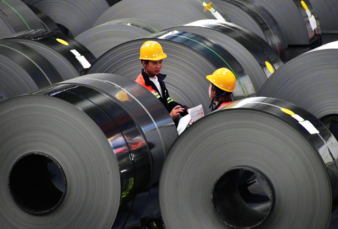 兩名質(zhì)檢員在福安青拓冷軋科技有限公司生產(chǎn)車間檢查不銹鋼卷成品(2022年8月17日攝)。新華社記者 魏培全 攝