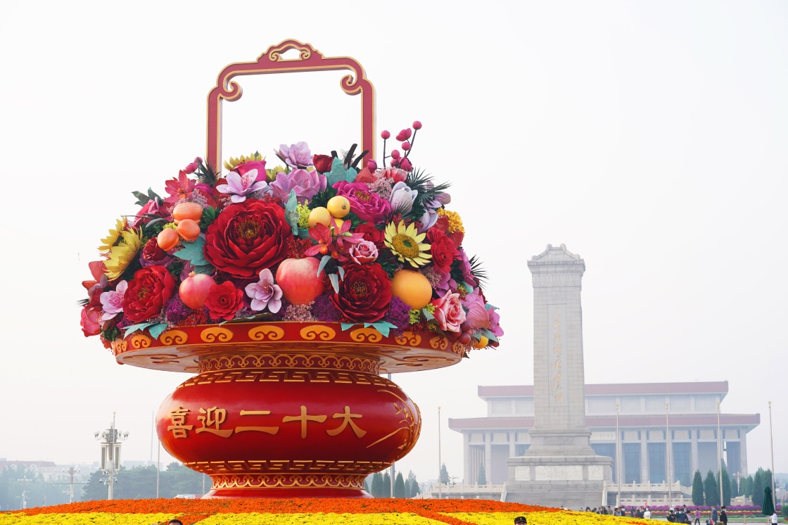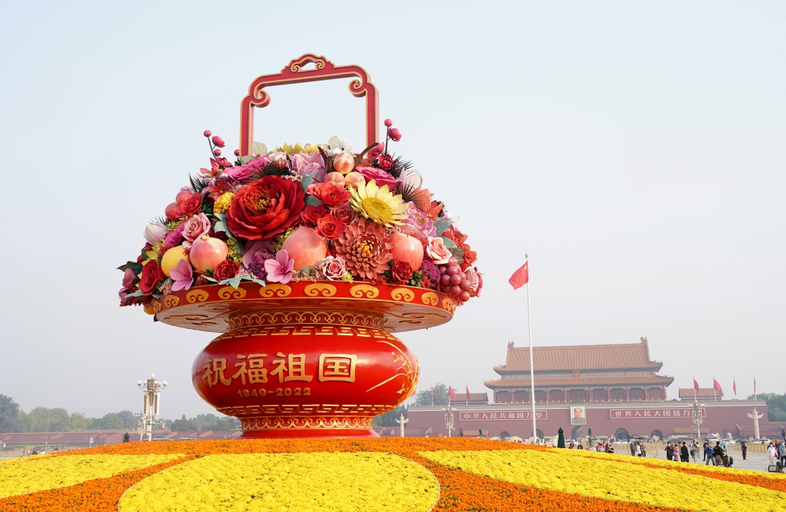 9月27日在天安門廣場拍攝的“祝福祖國”巨型花果籃。新華社記者 任超 攝
