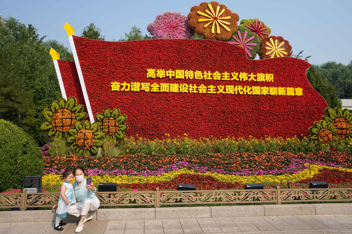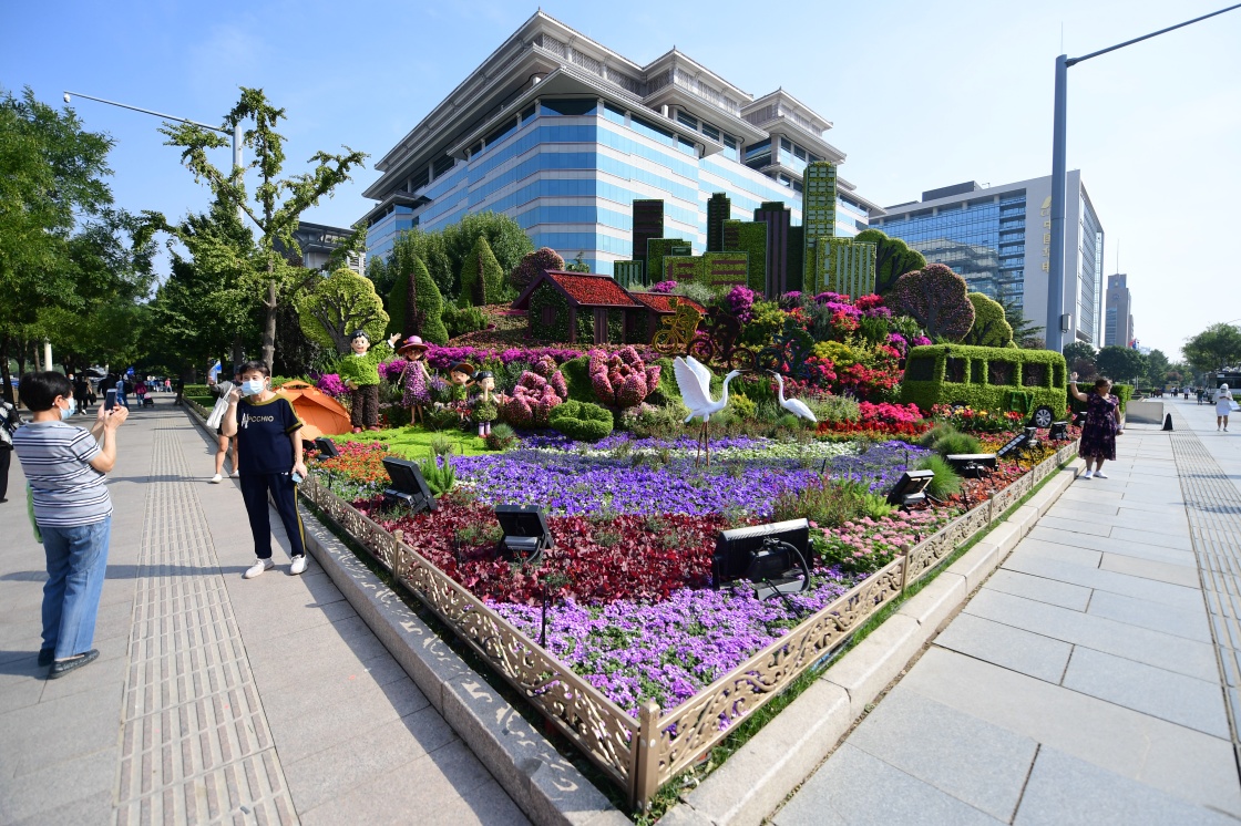 9月27日,市民在西單路口拍攝“富裕生活”花壇。新華社記者 張晨霖 攝