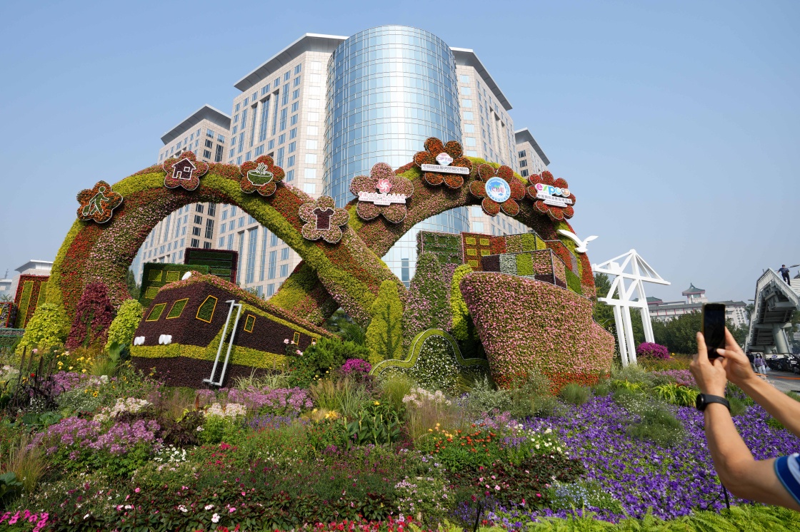 9月27日在軍事博物館前拍攝的“命運(yùn)共同體”花壇。新華社記者 張晨霖 攝