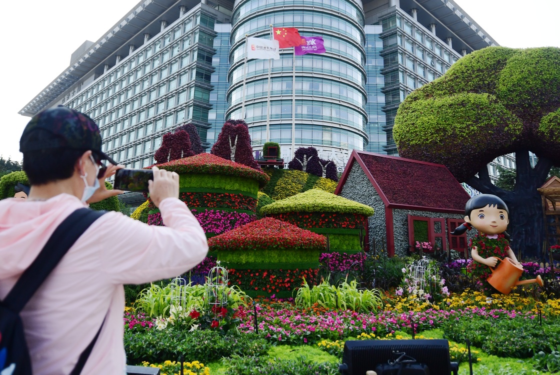 9月27日,市民在東單路口拍攝“開放發(fā)展”花壇。新華社記者 鞠煥宗 攝