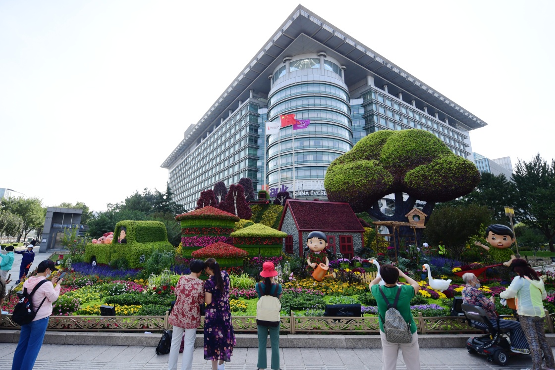 9月27日在軍事博物館前廣場拍攝的“命運(yùn)共同體”花壇。新華社記者 張晨霖 攝