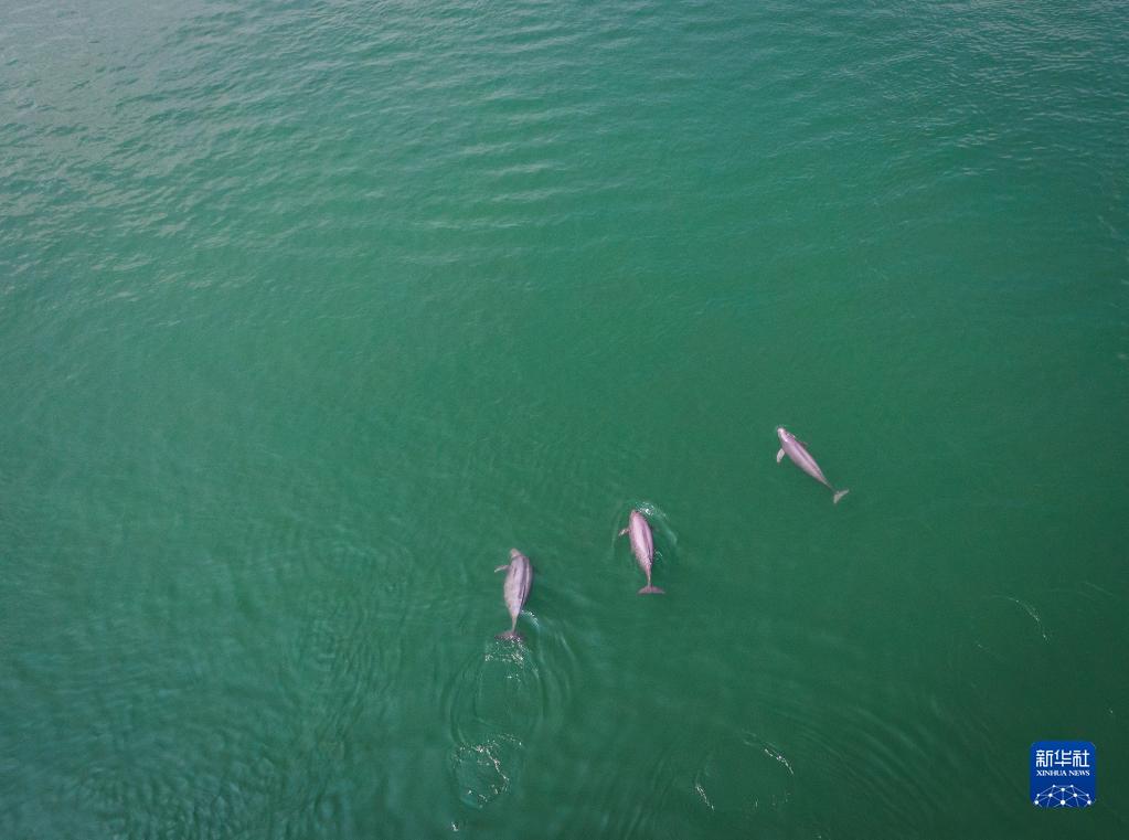 在湖北省宜昌市,長江江豚在水中嬉戲(2021年5月11日攝,無人機(jī)照片)。新華社記者 肖藝九 攝