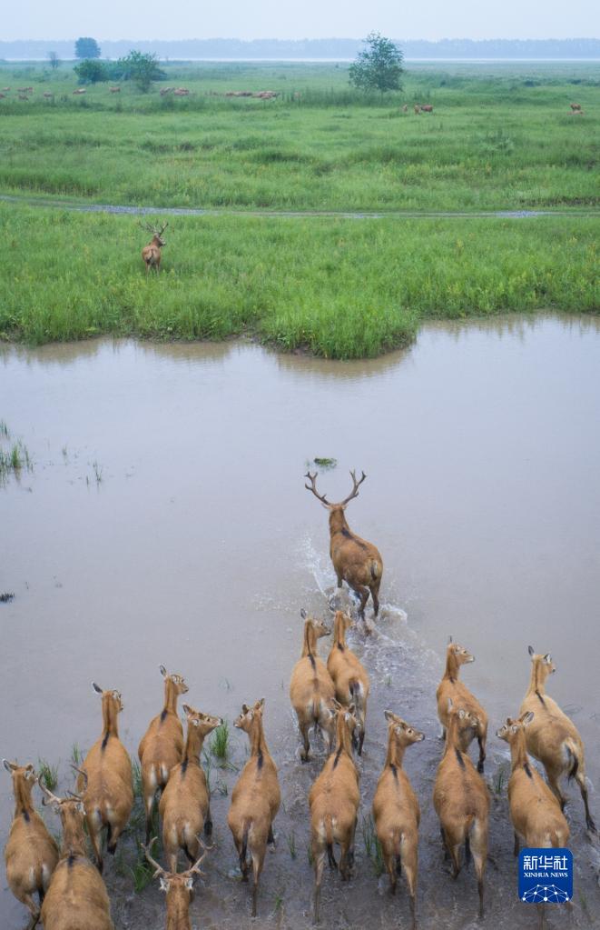 一群麋鹿在石首麋鹿國家級(jí)自然保護(hù)區(qū)內(nèi)活動(dòng)(2021年5月17日攝,無人機(jī)照片)。新華社記者 肖藝九 攝