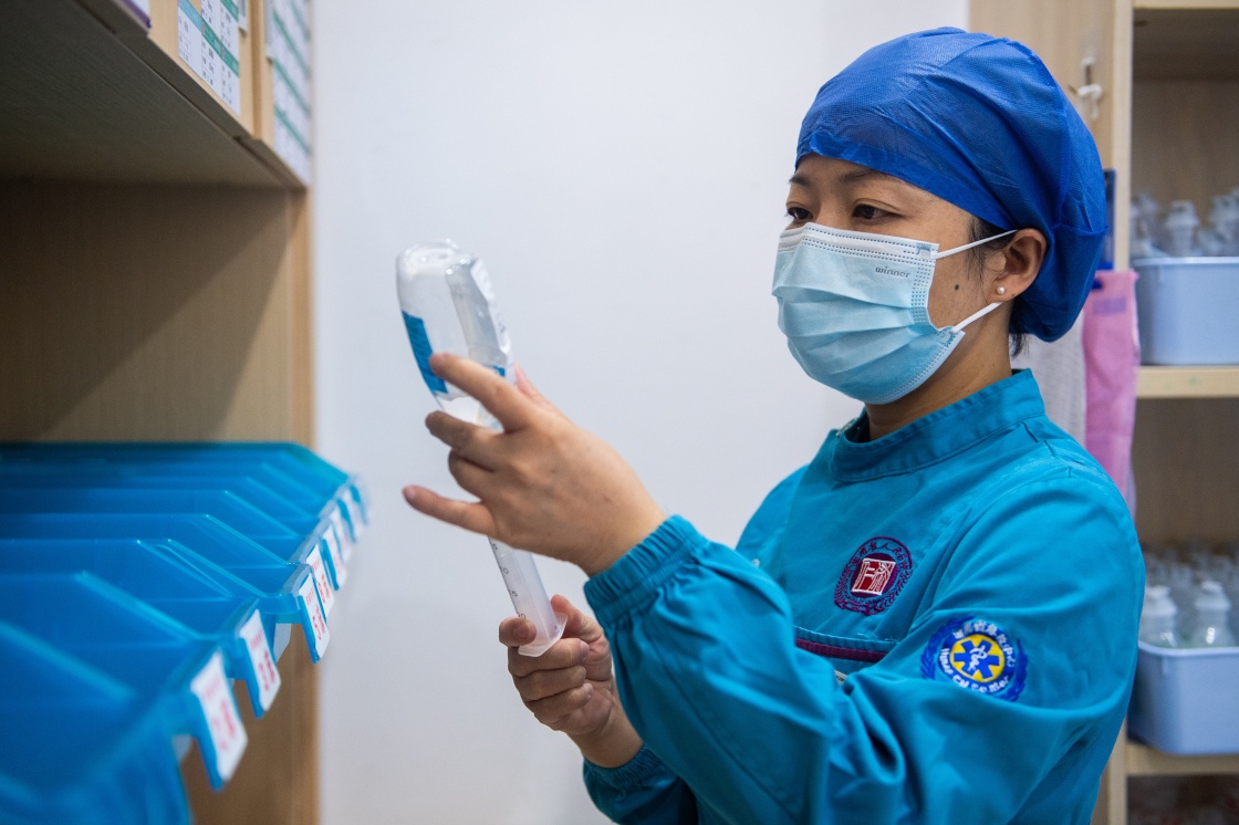 在湖南省人民醫(yī)院ICU病房治療室,徐芙蓉在配藥(2022年9月9日攝)。新華社記者 陳思汗 攝