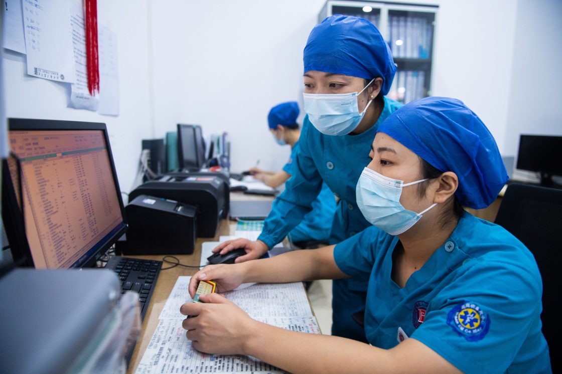 在湖南省人民醫(yī)院ICU病房護(hù)士站,徐芙蓉(中)和同事查看病人住院記錄(2022年9月9日攝)。新華社記者 陳思汗 攝