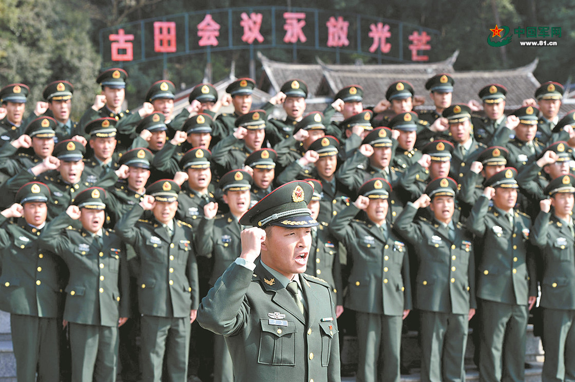 第73集團(tuán)軍某旅組織官兵在古田會(huì)議舊址前重溫入黨誓詞。劉志勇攝