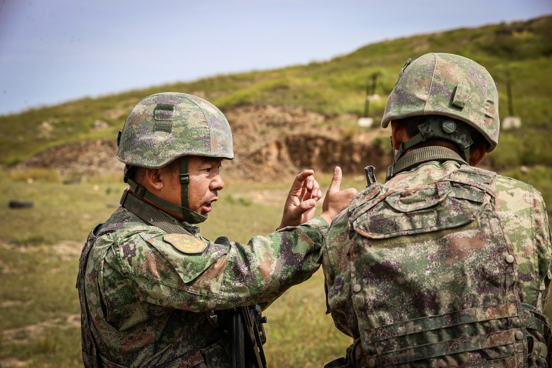 陸軍第71集團(tuán)軍某旅“濟(jì)南英雄連”連長(zhǎng)孫金龍(左)在訓(xùn)練場(chǎng)上為連隊(duì)?wèi)?zhàn)士講解據(jù)槍動(dòng)作要領(lǐng)(2022年9月21日攝)。新華社發(fā)(黃振宇 攝)