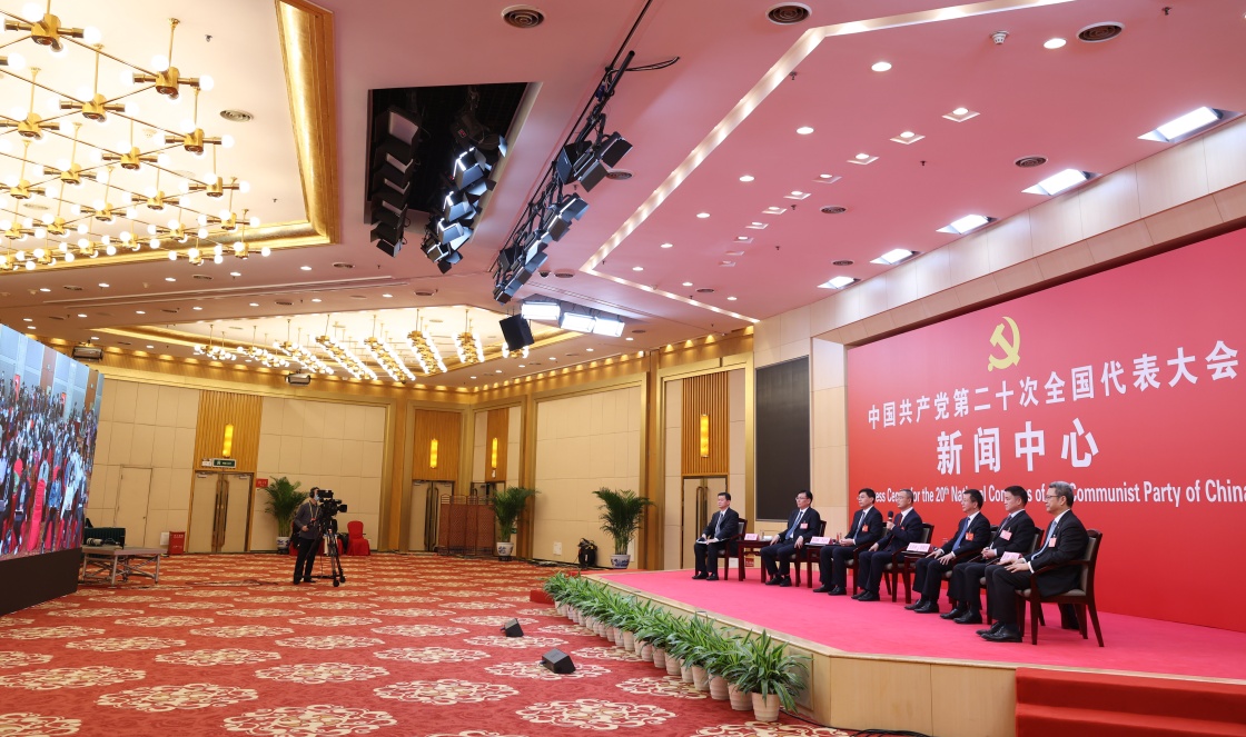 10月20日,中國共產(chǎn)黨第二十次全國代表大會新聞中心舉行集體采訪。青海、寧夏、新疆、中央和國家機(jī)關(guān)、中央金融系統(tǒng)、中央企業(yè)系統(tǒng)(在京)代表團(tuán)新聞發(fā)言人出席,介紹代表團(tuán)學(xué)習(xí)討論二十大報告情況,并回答記者提問。新華社記者 陳建力 攝
