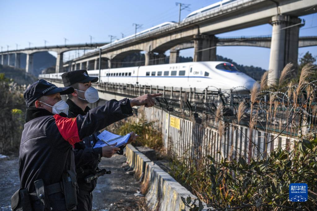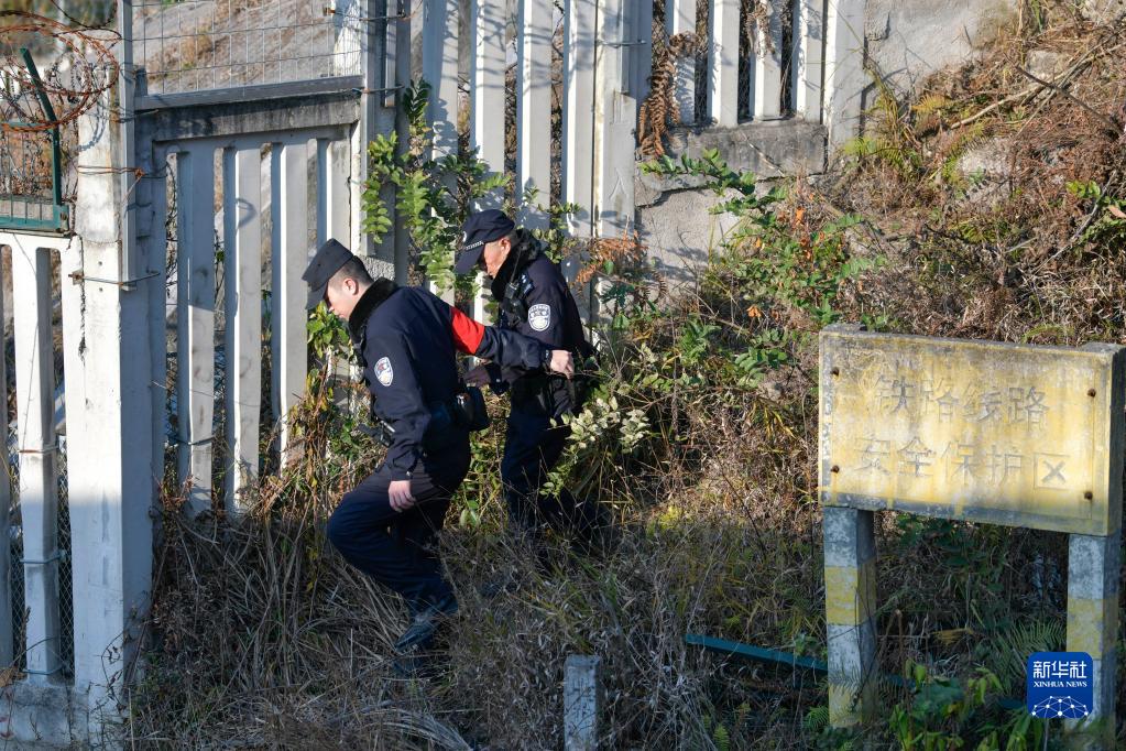 1月8日,鐵路警察王云(中)、謝源(左)與鐵路巡防員進行線路安全巡查。新華社記者 楊文斌 攝