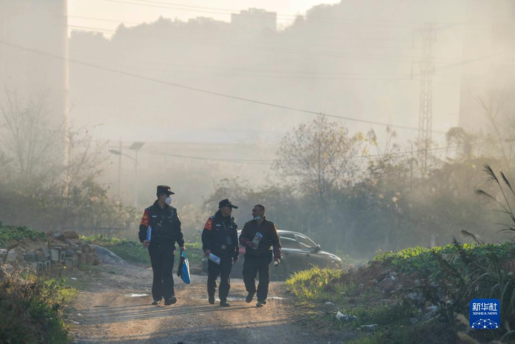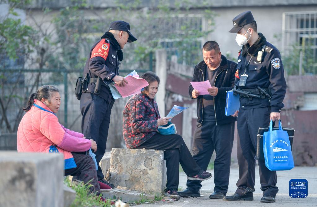 1月8日,鐵路警察王云(左二)和謝源(右一)向居住在鐵路沿線的村民發(fā)放鐵路法治宣傳資料。新華社記者 楊文斌 攝