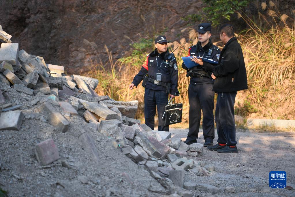 1月8日,鐵路警察王云(左)和謝源(中)對堆放建筑廢料影響鐵路橋墩穩(wěn)定的村民進行勸導。新華社記者 楊文斌 攝