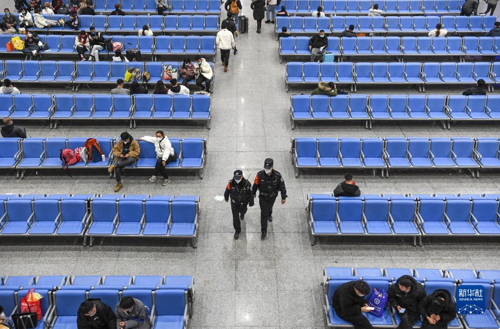 1月8日,鐵路警察王云(左)和謝源在貴陽東站候車室進行站區(qū)巡查。新華社記者 楊文斌 攝