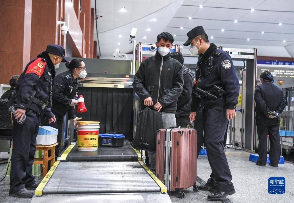 1月8日,鐵路警察王云(前左一)和謝源(前右一)在貴陽東站督導乘客進站安檢情況。新華社記者 楊文斌 攝