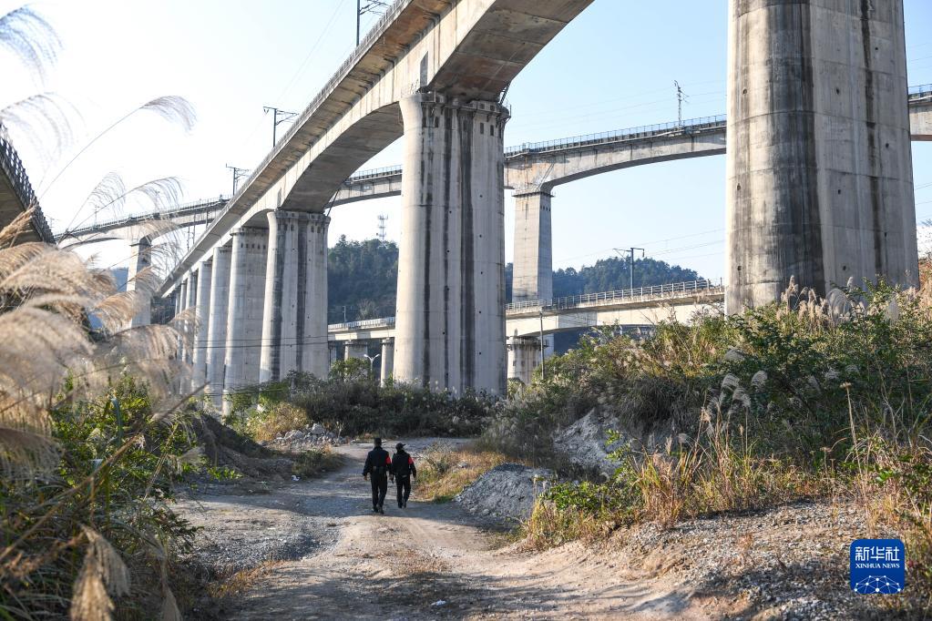 1月8日,鐵路警察王云(右)和謝源在鐵路沿線進行線路安全巡查。新華社記者 楊文斌 攝