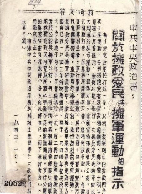 1943年10月1日,中共中央政治局頒布《關(guān)于擁政愛民與擁軍運動的指示》決定,以后每年的農(nóng)歷正月都要舉行一次擁政和擁軍的大規(guī)模群眾運動。