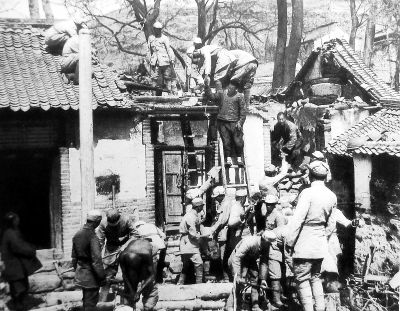 八路軍戰(zhàn)士為當(dāng)?shù)厝罕娦扪a房屋。