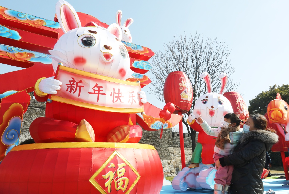 1月16日,在江蘇省蘇州市古胥門廣場,小朋友在家長陪同下觀賞彩燈“福兔迎春”。