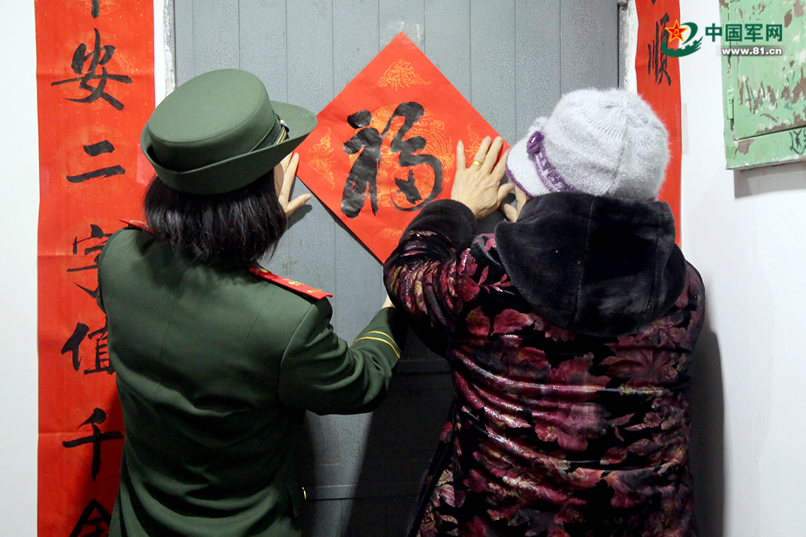 在一片溫馨的氛圍中,官兵們?yōu)榛輯寢屬N上了官兵自己書寫的春聯(lián)和福字。“過年了,我們給您拜個年,祝您新年快樂,身體健康!”看著滿屋子過年的氣息,惠媽媽感動地拉著官兵的手說:“你們真是好孩子!”