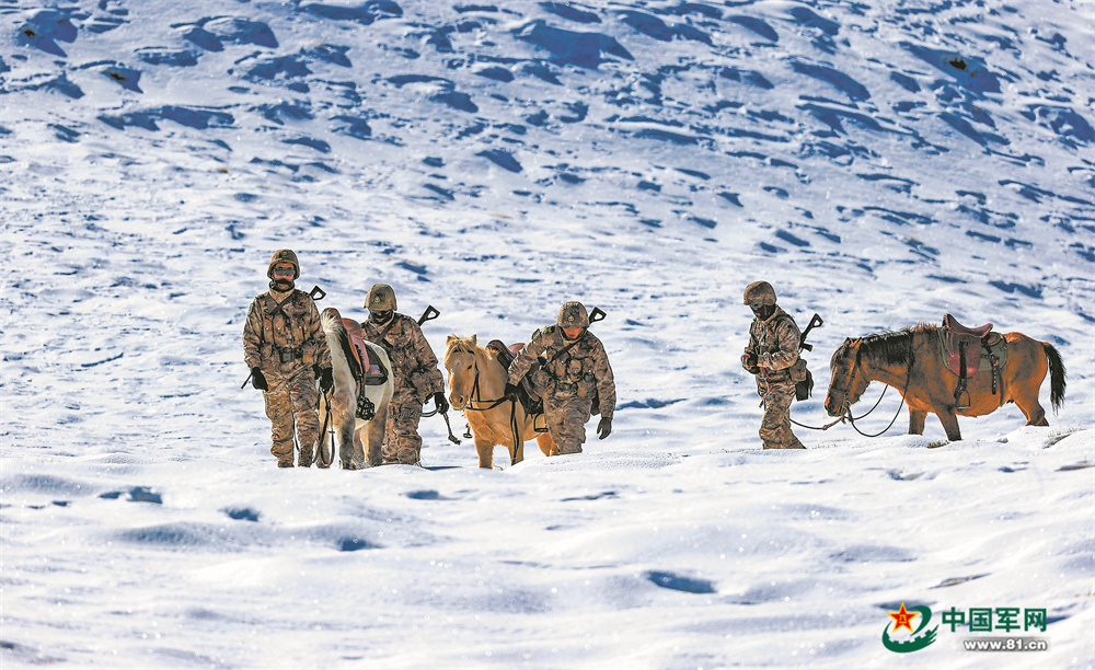 阿里軍分區(qū)某邊防團官兵在邊防一線踏雪巡邏。劉曉東攝