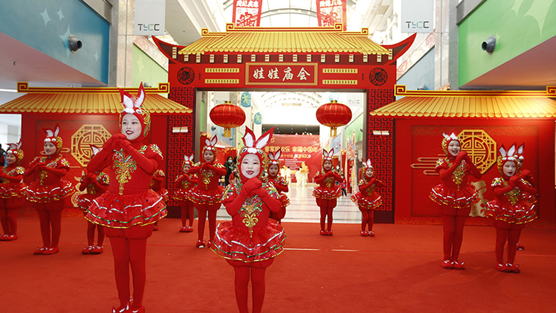 開街儀式上,“小兔子”拿著糖葫蘆、提著燈籠逛廟會,和舞龍舞獅一起表演助興,嘉賓們展開寫著“津味津韻津氣神”“童心童樂童前行”的對聯(lián),宣布“娃娃廟會開街啦”!