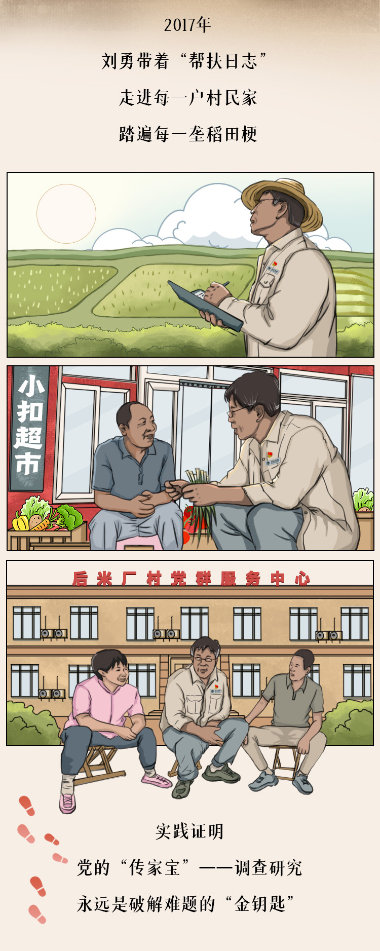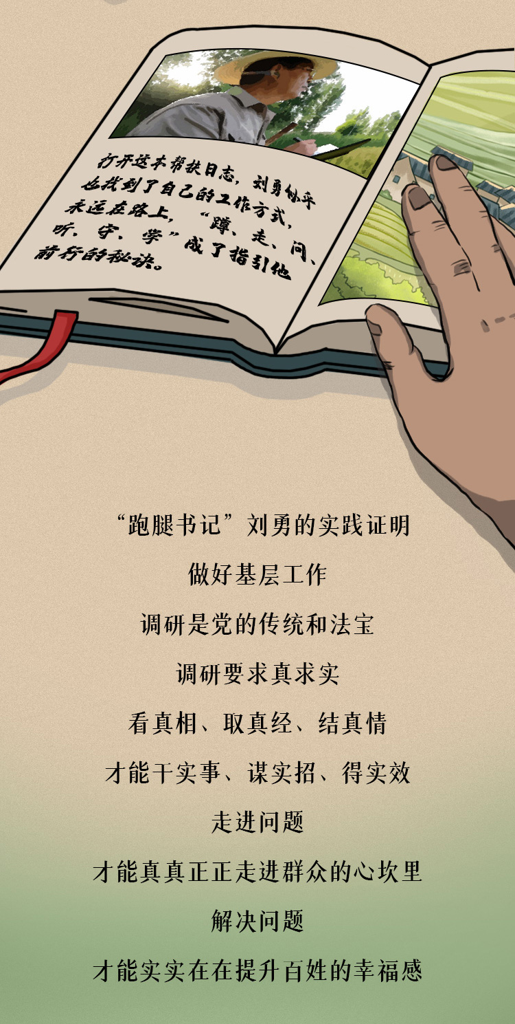 一頂草帽遮擋刺眼的陽光;一根木棍支撐多年的傷腿;一本調(diào)研筆記寫滿百姓的急難愁盼,長卷中,劉勇帶著這“老三件”,走遍村莊的每寸土地,解決村民的每個問題,鄉(xiāng)親們都親切地稱他為“跑腿書記”……