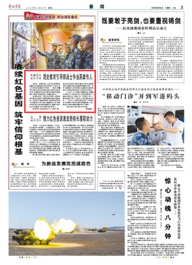 該團(tuán)前身是一支陜北紅軍部隊(duì),曾因戰(zhàn)場(chǎng)表現(xiàn)突出被授予“勇猛頑強(qiáng)英雄團(tuán)”榮譽(yù)稱號(hào)。多年來(lái),盡管數(shù)次移防,但該團(tuán)堅(jiān)持開(kāi)展“紅色基因代代傳”活動(dòng),每逢新兵入伍、新排長(zhǎng)報(bào)到、新干部任職等重要時(shí)機(jī),都要為他們注入紅色基因,引導(dǎo)大家爭(zhēng)當(dāng)紅色傳人。