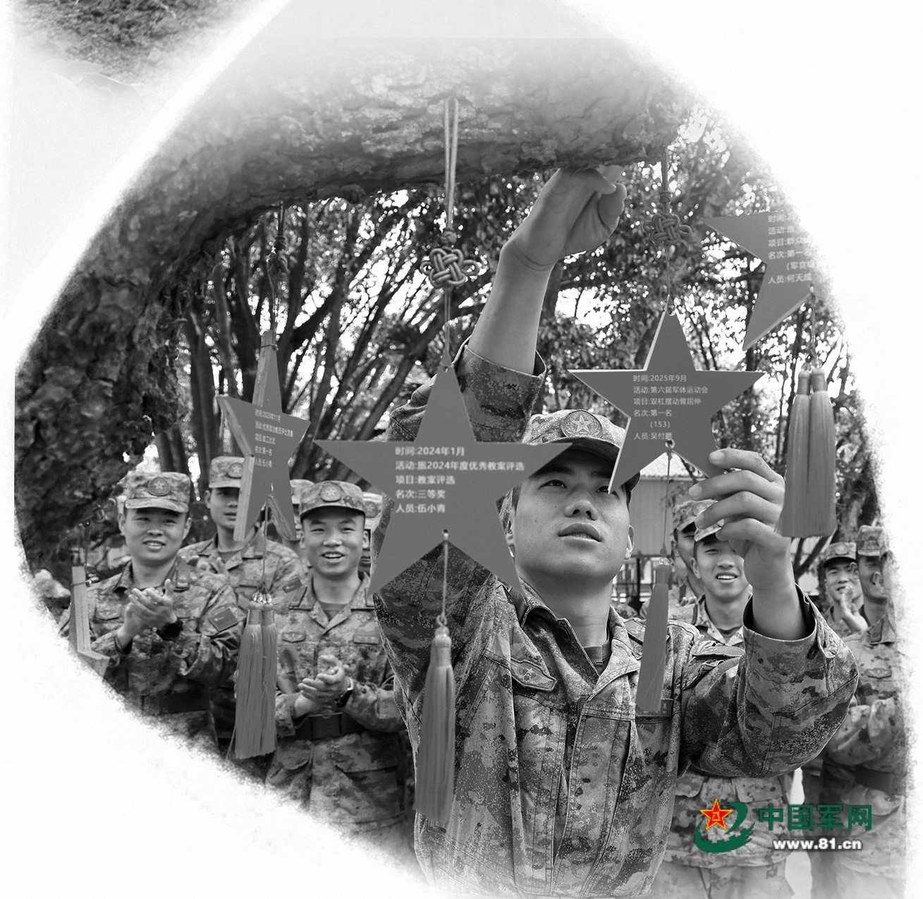 2023年,時(shí)任指導(dǎo)員注意到火焰樹呈“V”字形分叉生長(zhǎng)?!癡”代表勝利,為激發(fā)官兵訓(xùn)練熱情,他決定凡有立功受獎(jiǎng)、獲評(píng)先進(jìn)、在重大任務(wù)中表現(xiàn)突出者,都要在火焰樹前舉行一次頒獎(jiǎng)儀式,將寫有榮譽(yù)事跡的五角星木牌掛上枝頭,這棵火焰樹由此成為連隊(duì)的榮譽(yù)樹。