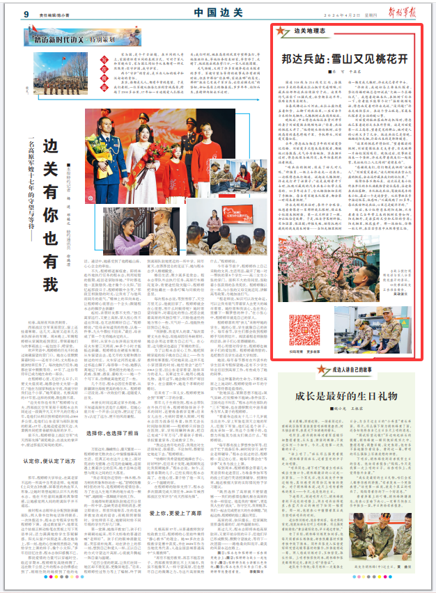 晚飯后,中士傅忠池給遠(yuǎn)在貴州畢節(jié)的妻子劉麗霞撥去視頻電話:“你看,兵站的桃花又開了。”他將鏡頭轉(zhuǎn)向桃樹,讓雪域高原的春色跨越千里。手機(jī)那頭,劉麗霞笑靨如花。
