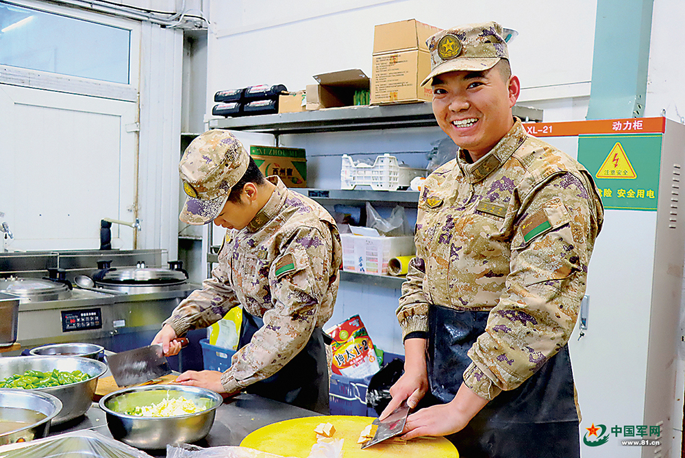 炊事班戰(zhàn)友正在準(zhǔn)備餐食。吳政波攝