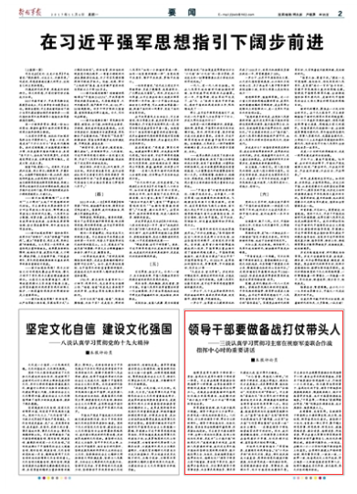 習(xí)主席在視察軍委聯(lián)合作戰(zhàn)指揮中心時強調(diào),全軍各級領(lǐng)導(dǎo)干部特別是高級干部要做備戰(zhàn)打仗帶頭人。這既是全面提高新時代備戰(zhàn)打仗能力的客觀要求,也是解決好“兩個能力不夠”“五個不會”等問題的緊迫任務(wù)。請關(guān)注今日《解放軍報》的報道——