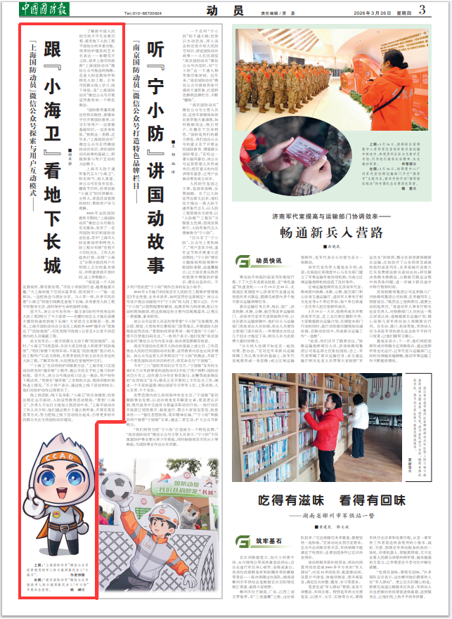 了解新中國人民防空的不平凡發(fā)展歷程、感受地下人防工程平戰(zhàn)結合的雙重功能、欣賞防護建筑的藝術化表達……春暖花開之際,很多上海市民按照“上海國防動員”微信公眾號推送的線路,走進人防宣教場所和特色人防工程。引導市民群眾線上學習、線下體驗,是“上海國防動員”微信公眾號開展宣傳教育的一個特色做法。