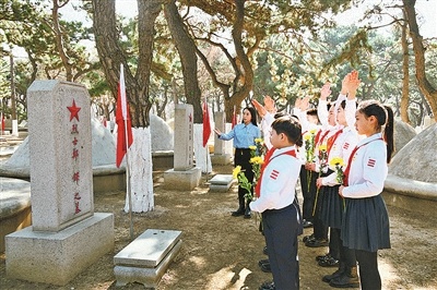 在沈陽(yáng)抗美援朝烈士陵園,沈陽(yáng)市沈河區(qū)文藝路第二小學(xué)少先隊(duì)員聆聽志愿軍戰(zhàn)斗故事,向英烈敬禮。姚振蜂攝