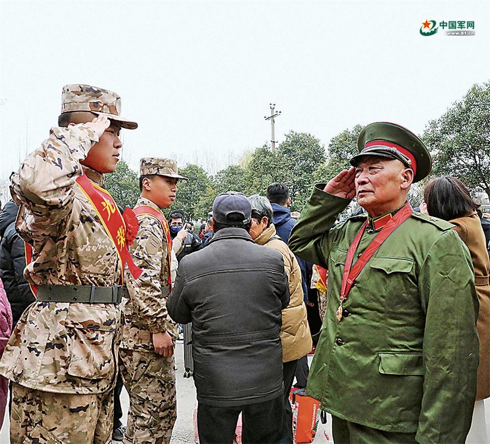 近日,在江蘇省沛縣2026年上半年入伍新兵歡送儀式現(xiàn)場,身著老式軍裝的退役老兵和即將奔赴軍營的孫子互敬軍禮。朱廣德 攝
