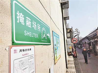 清明時節(jié),北京市隆福寺文化街區(qū)熙熙攘攘、人流如織。細(xì)心的游客發(fā)現(xiàn),街區(qū)四周小巷入口處都掛著疏散掩蔽標(biāo)識牌,牌子上藍(lán)色的人防工程示意圖十分醒目。