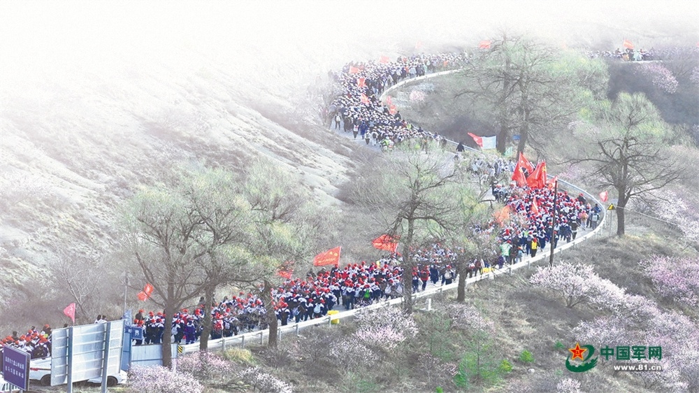 清晨,記者跟隨師生隊(duì)伍向著任山河烈士陵園出發(fā)。浩浩蕩蕩的隊(duì)伍綿延幾公里,像一條長龍盤踞在黃峁山蜿蜒的山路上,兩旁盛放的山桃花和學(xué)生們高舉的紅旗交相輝映。
