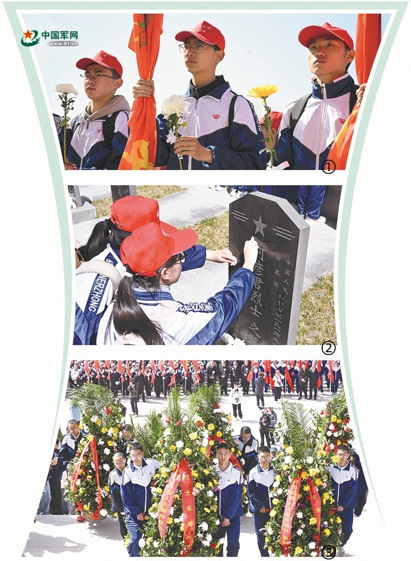 圖①:學(xué)生手持菊花面向革命烈士紀(jì)念碑。圖②:固原二中學(xué)生擦拭烈士墓碑。圖③:在任山河烈士陵園,學(xué)生代表向革命烈士紀(jì)念碑敬獻(xiàn)花籃。