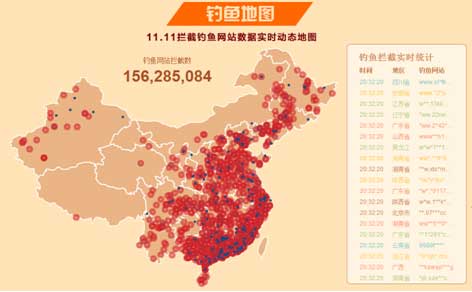 “雙11”中國網(wǎng)購釣魚地圖實時全景顯示釣魚網(wǎng)站分布。