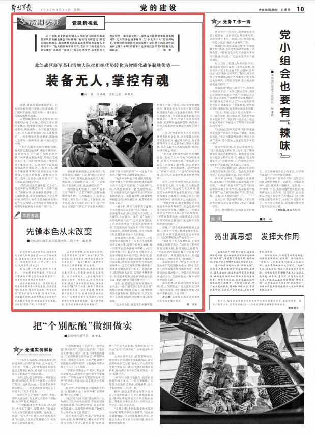 “智能化戰(zhàn)場,最關鍵的從來不是裝備本身的升級換代,而是黨組織領導力的同步升級?!迸灅蛏?,一位艦長緊盯遠方的無人艇,語氣沉穩(wěn)地說,“不管裝備多先進、戰(zhàn)場多復雜,黨組織牢牢領戰(zhàn)把握方向,就是我們克敵制勝最大的底氣?!?/p>