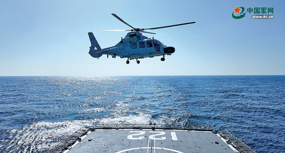 “前方海域發(fā)現(xiàn)多批可疑目標(biāo)?!薄爸鄙龣C起降部署!”隨著指令下達,唐山艦飛行甲板上,艦載直升機騰空而起,快速前出至“目標(biāo)”海域上空,低空盤旋鎖定“目標(biāo)”,實時向編隊回傳信息。