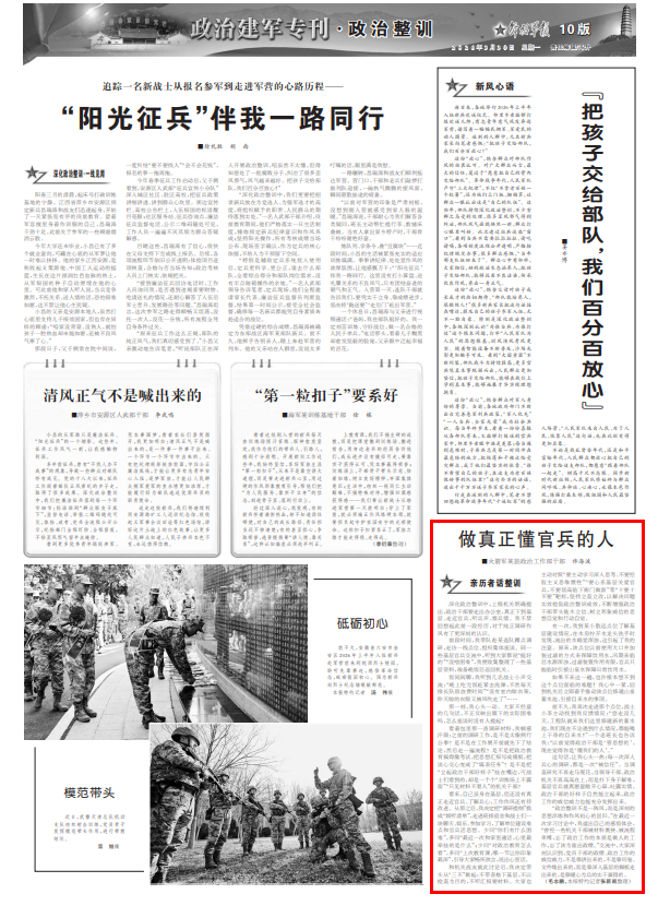 前不久,我再次走進(jìn)那個(gè)點(diǎn)位,戰(zhàn)士小李主動(dòng)找到我反饋情況:“您走沒(méi)幾天,工程隊(duì)就來(lái)我們這里修建新的蓄水池,我們現(xiàn)在不論遇到什么情況,都能喝上干凈的自來(lái)水!”一個(gè)老班長(zhǎng)也告訴我:“以前覺(jué)得政治干部是‘管思想的’,現(xiàn)在覺(jué)得你是‘懂我們的人’?!?/p>