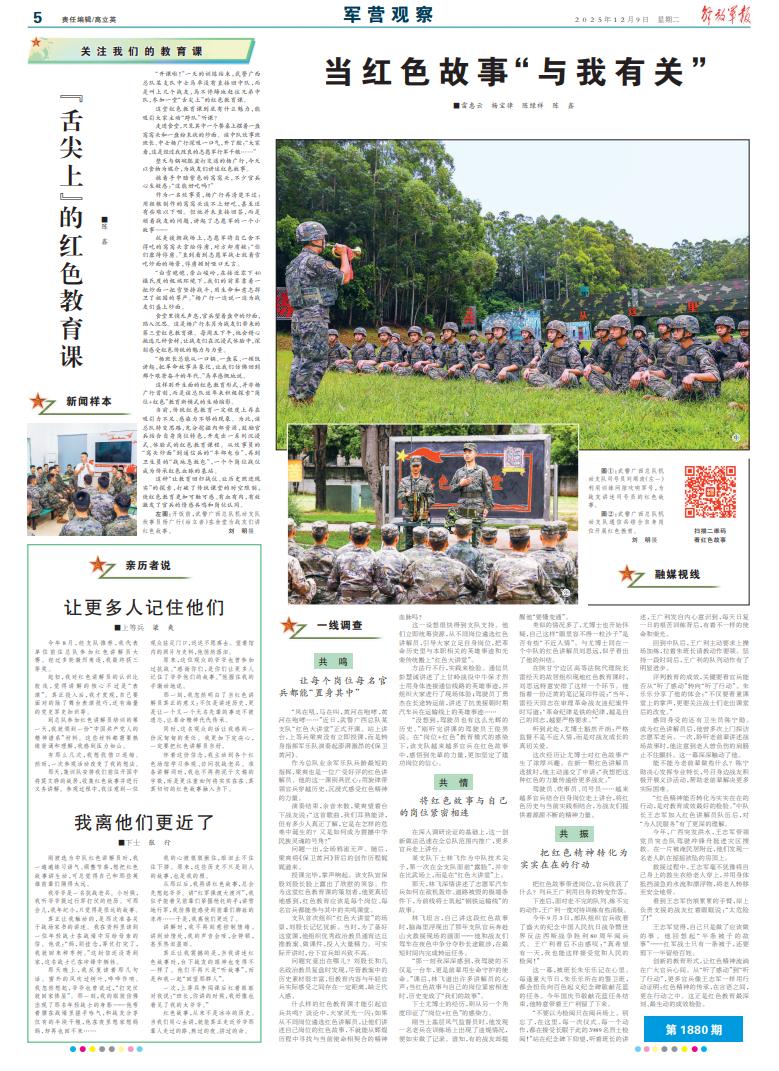 真正讓我震撼的是,當我講述紅色故事時,臺下戰(zhàn)友的眼神也變得不一樣了。他們不再只是“聽故事”,而是和我一起“回望那群人”。