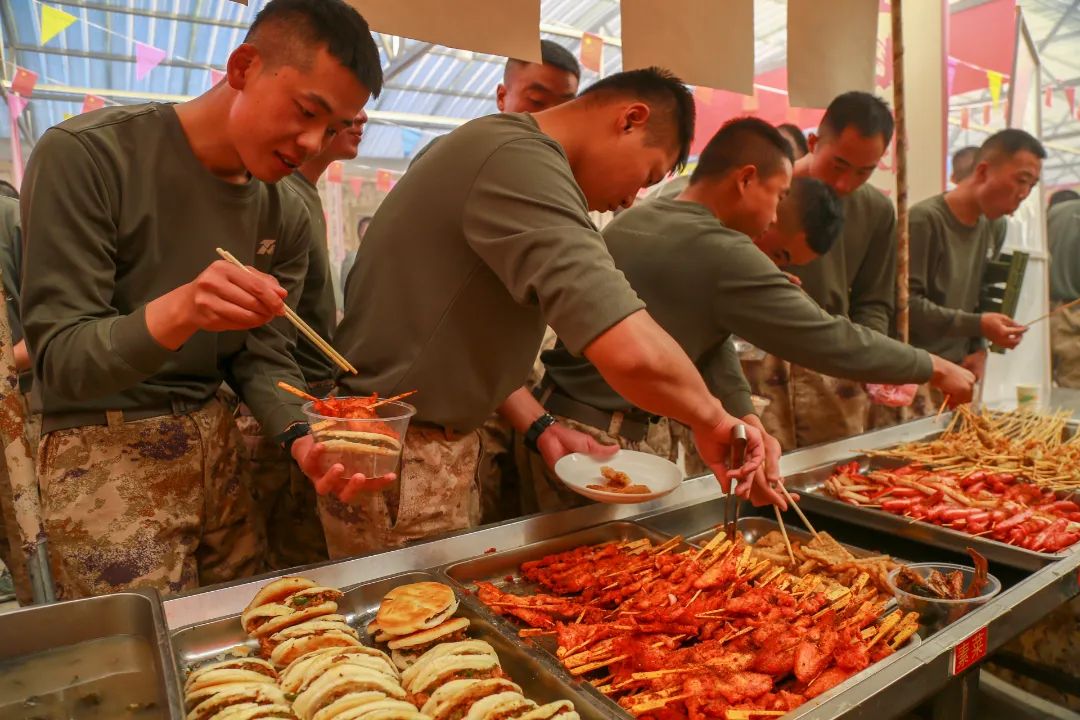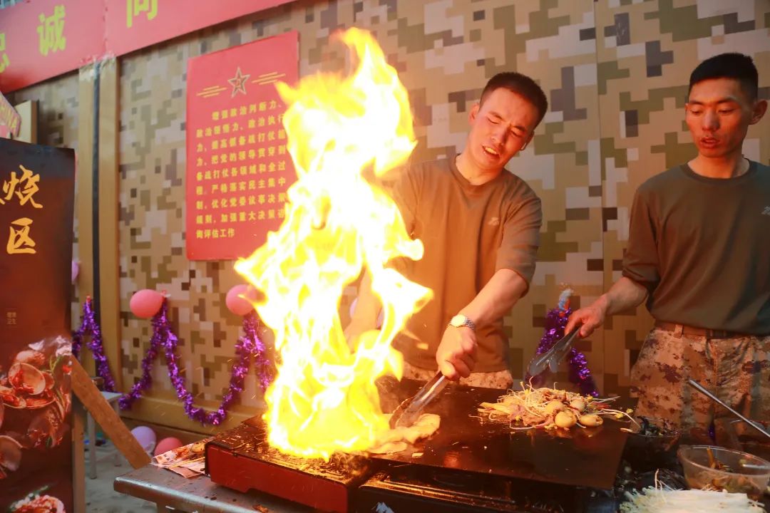 在官兵們的精心布置下,營區(qū)內(nèi)搖身變成美食廣場(chǎng),煙火升騰、歡聲四起,各類小吃攤排列整齊,兵哥哥們搖身變成美食大廚。