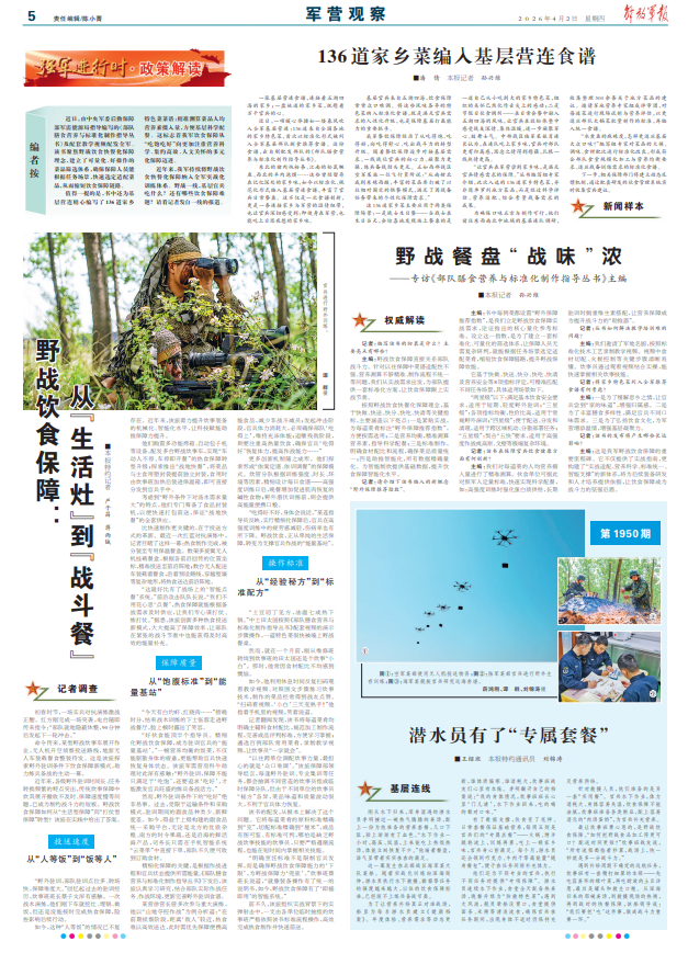 主編:野戰(zhàn)飲食保障直接關系部隊戰(zhàn)斗力。針對以往保障中菜譜適配性不強、營養(yǎng)測算不夠精準、制作流程不統(tǒng)一等問題,我們從實戰(zhàn)需求出發(fā),為部隊提供一套標準化方案,讓飲食保障跟上實戰(zhàn)節(jié)奏。
