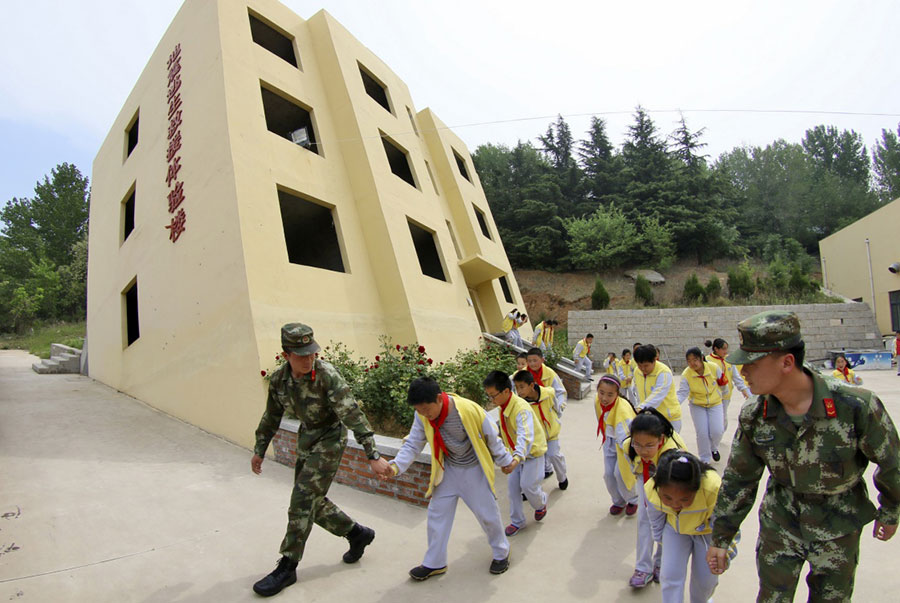5月11日,在山東煙臺(tái)地震科普教育基地,武警煙臺(tái)支隊(duì)官兵引導(dǎo)共建學(xué)校的小學(xué)生們體驗(yàn)地震逃生。新華社發(fā) 唐克攝