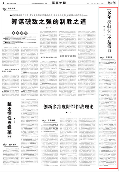 平時(shí)工作中,有些官兵會(huì)不經(jīng)意間把很多問(wèn)題產(chǎn)生的原因歸結(jié)于“多年沒(méi)打仗”。軍不思戰(zhàn),國(guó)之大患。軍隊(duì)多年不聞硝煙味,容易產(chǎn)生一些負(fù)面或消極因素。但如果把很多問(wèn)題都?xì)w結(jié)為多年沒(méi)打仗造成的,甚至把它當(dāng)成不作為和懈怠的借口,則是十分錯(cuò)誤的。
